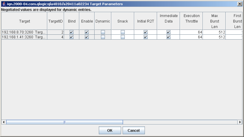 - For dynamic targets (discovered using SLP or the SendTargets command), the values that display are the negotiated values unless these values were modified using the Target Configuration Parameters dialog box.