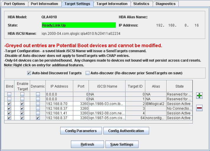 - Bind. Whether the specific target is bound to the HBA port. Targets for which the Bind check box is not selected will not persist across save operations unless they are rediscovered using one of the target discovery methods.