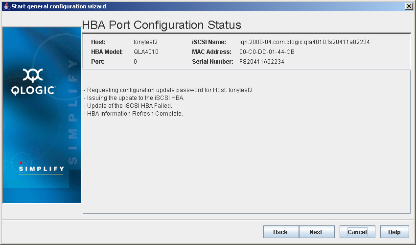- The HBA Port Configuration Status dialog box displays (see the illustration below).